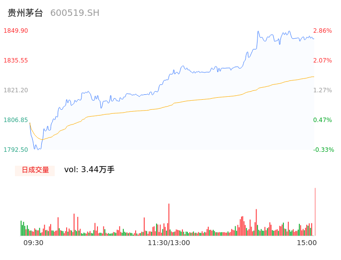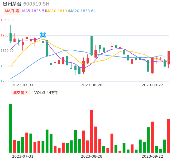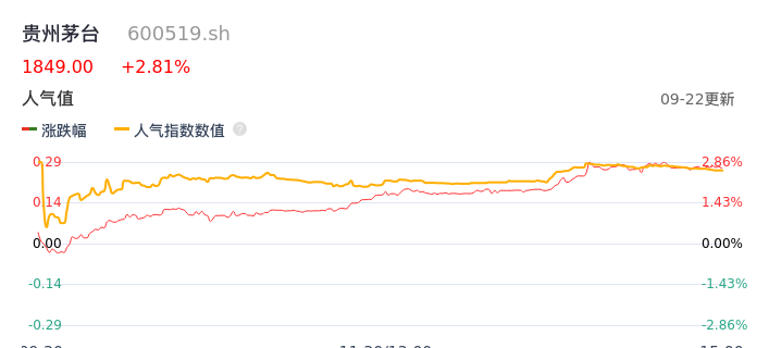 09月22日,贵州茅台收报1849.00,股价涨幅2.81%,成交金额62.88亿元,换手率0.27%。