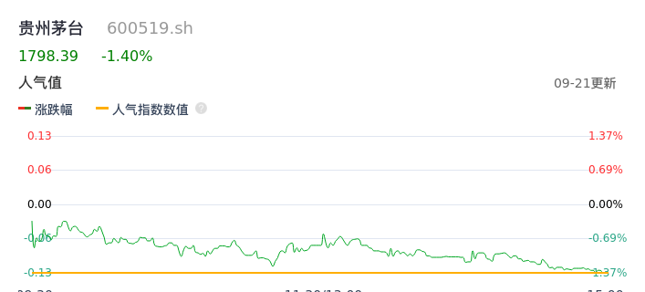 09月21日,贵州茅台收报1798.39,股价涨幅-1.40%,成交金额35.21亿元,换手率0.16%。