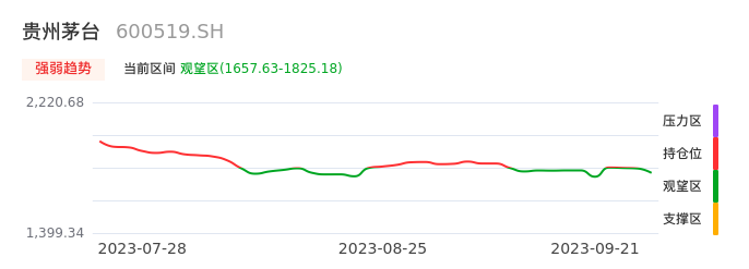 我们来看一下该股的九方特色指标强弱趋势的情况:贵州茅台自09月19日从持仓区下穿到观望区,股价近期持续走弱。短期已经进入空头行情,且下跌动能仍未衰竭。建议继续谨慎观望。
