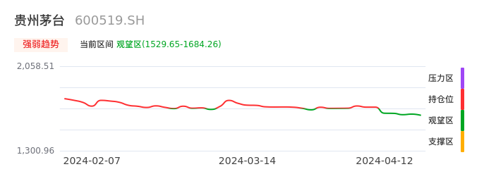 我们来看一下该股的九方特色指标强弱趋势的情况:贵州茅台自04月08日从持仓区下穿到观望区,股价近期持续走弱。短期已经进入空头行情,且下跌动能仍未衰竭。建议继续谨慎观望。