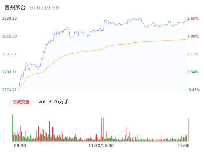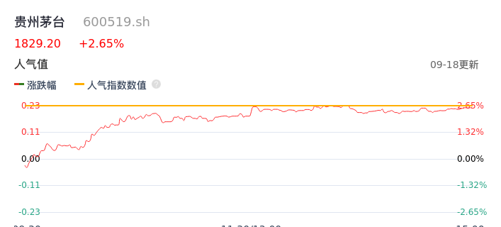 09月18日,贵州茅台收报1829.20,股价涨幅2.65%,成交金额59.05亿元,换手率0.26%。