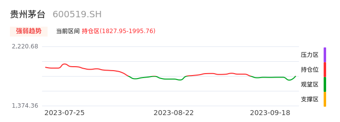 我们来看一下该股的九方特色指标强弱趋势的情况:贵州茅台近日从观望区上穿到持仓区。股价短期站稳多头区域,上升动能仍较为充足,可积极关注。后续重点关注上方压力位:1995.76元是否能突破上攻。
