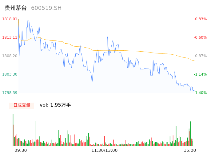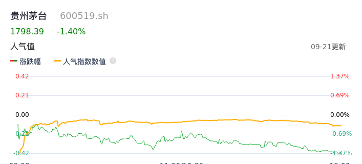 09月21日,贵州茅台收报1798.39,股价涨幅-1.40%,成交金额35.21亿元,换手率0.16%。