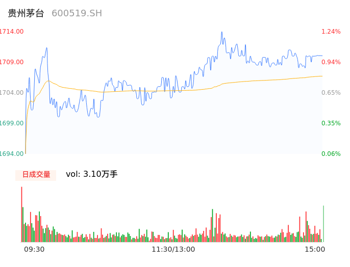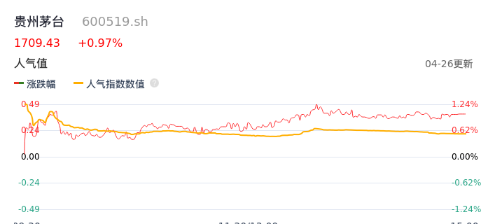 04月26日,贵州茅台收报1709.43,股价涨幅0.97%,成交金额52.90亿元,换手率0.25%。