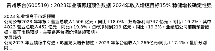 值得注意的是:2024年04月中金公司的王文丹/祝美学分析师,首次发布关于贵州茅台的研究报告,标题为:贵州茅台(600519):2023年业绩再超预告数据 2024年收入增速目标15% 稳健增长确定性强。