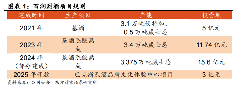 资金投入量大,规模领先,具备先发优势。截至2024年底,百润在烈酒板块已投资超35亿元,形成年产能规划谷物线2.6万吨,包括伏特加以及谷物类威士忌新酒(3.1万吨纯酒精)和0.4万吨麦芽威士忌新酒(0.48万吨纯酒精)的产能规模。同时,酒厂规划了6.775万吨威士忌陈酿熟成储藏能力,橡木桶储存基酒量2024年已达40万桶,占行业80%左右。