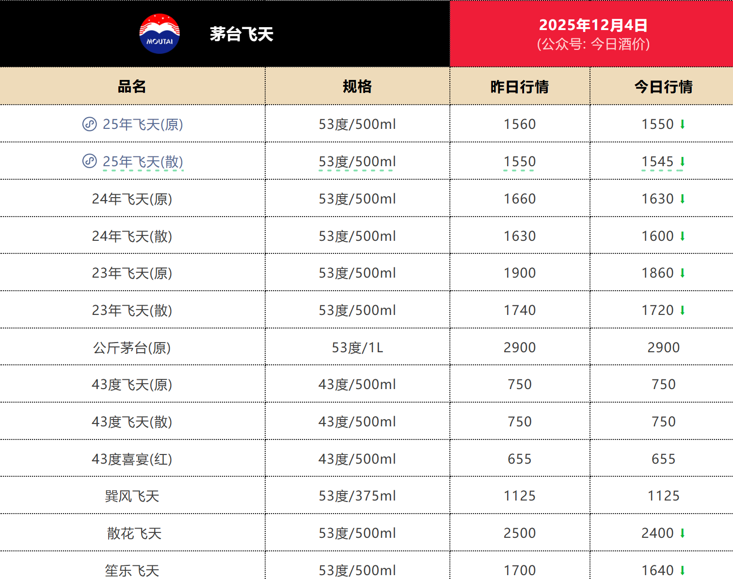 上证报中国证券网讯继近日跌破1600元关口之后,飞天茅台价格继续下滑。据酒业数据平台“今日酒价”12月4日最新数据显示,25年飞天(散)53度/500ml批发价为1545元/瓶,较昨日下跌5元;25年飞天(原)53度/500ml价格报1550元/瓶,较昨日下跌10元。