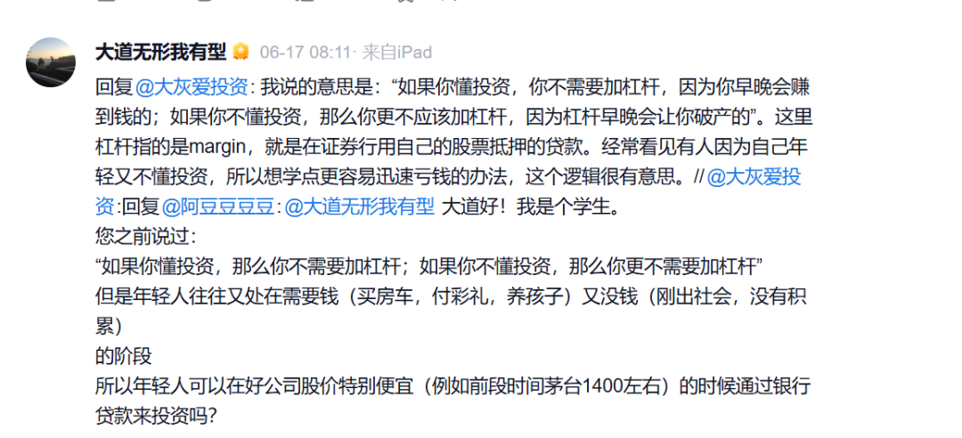 不过,虽然十分看好贵州茅台的投资价值,段永平反对加杠杆投资。有位网友提问:“年轻人可以在好公司股价特别便宜(例如前段时间茅台1400元左右)的时候通过银行贷款来投资吗?”