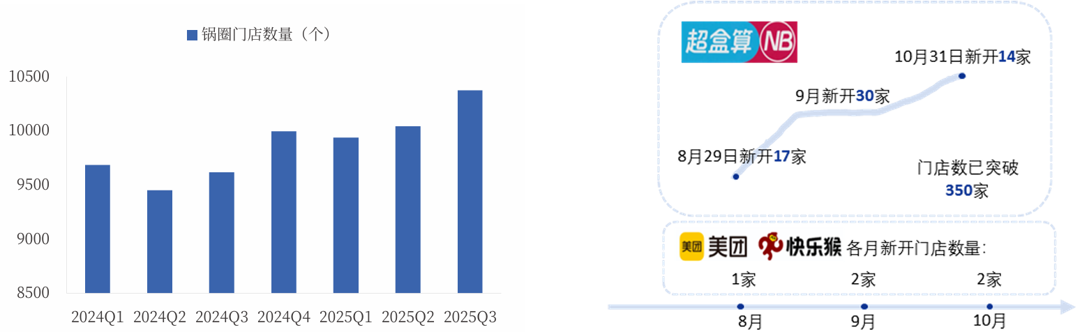 性价比业态有望在更多品类快速扩张。1)速冻预制菜领域,主打性价比的锅圈快速扩店,极海数据口径2025年至今公司净开店878家,2026年计划进一步探索“锅圈小炒”等新业态,并继续拓展乡镇门店。2)全品类领域,盒马NB、美团折扣猴等2025年 8月以来开始扩张,硬折扣社区超市业态的发展潜力较大,2026年有望带动上游供应链公司。