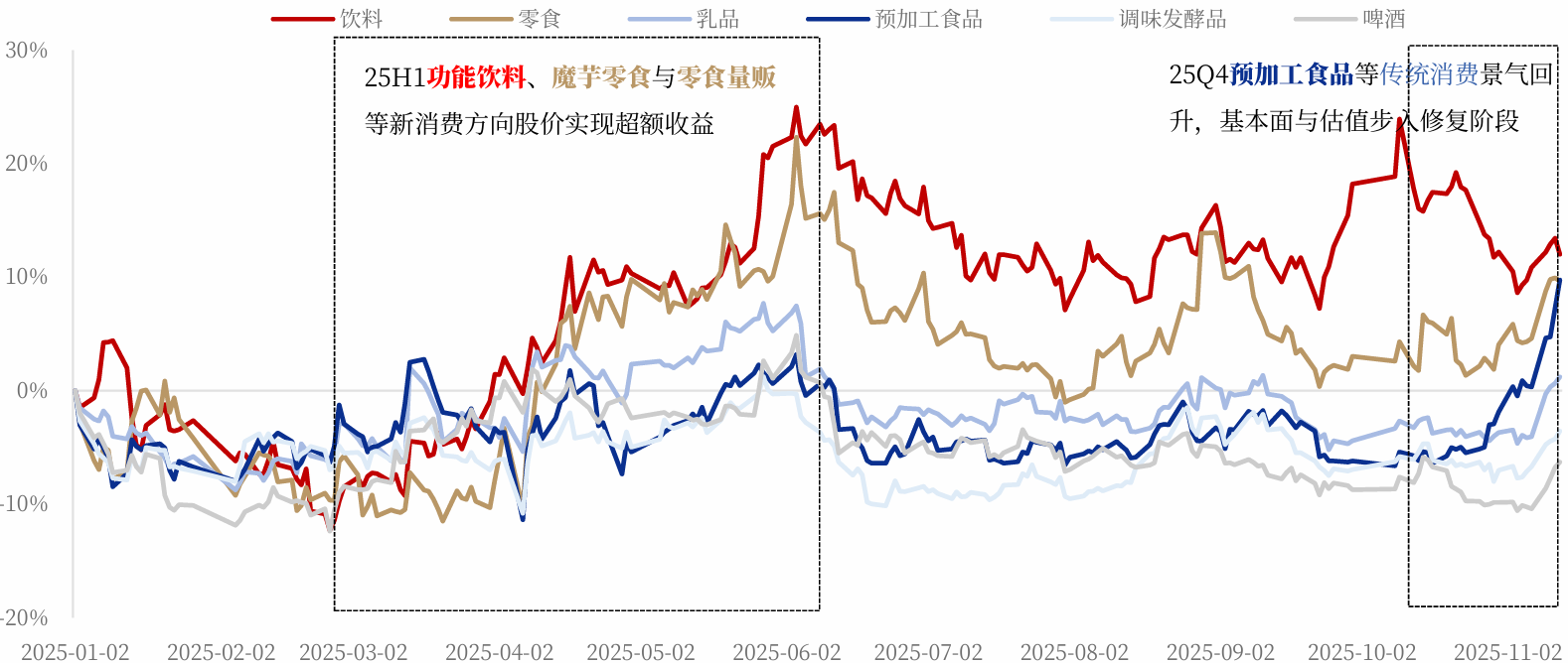 从结构来看,白酒周期调整为主要因素,大众品复苏长期趋势不变,并且内部节奏呈现H1新消费领先、H2传统消费修复接力。25H1功能饮料、魔芋零食与零食量贩延续2024年以来的高度景气,相关企业收入实现高速增长、股价实现超额收益;25H2部分预加工食品品类景气回升,行业竞争边际放缓,相关企业基本面与估值均步入修复阶段。