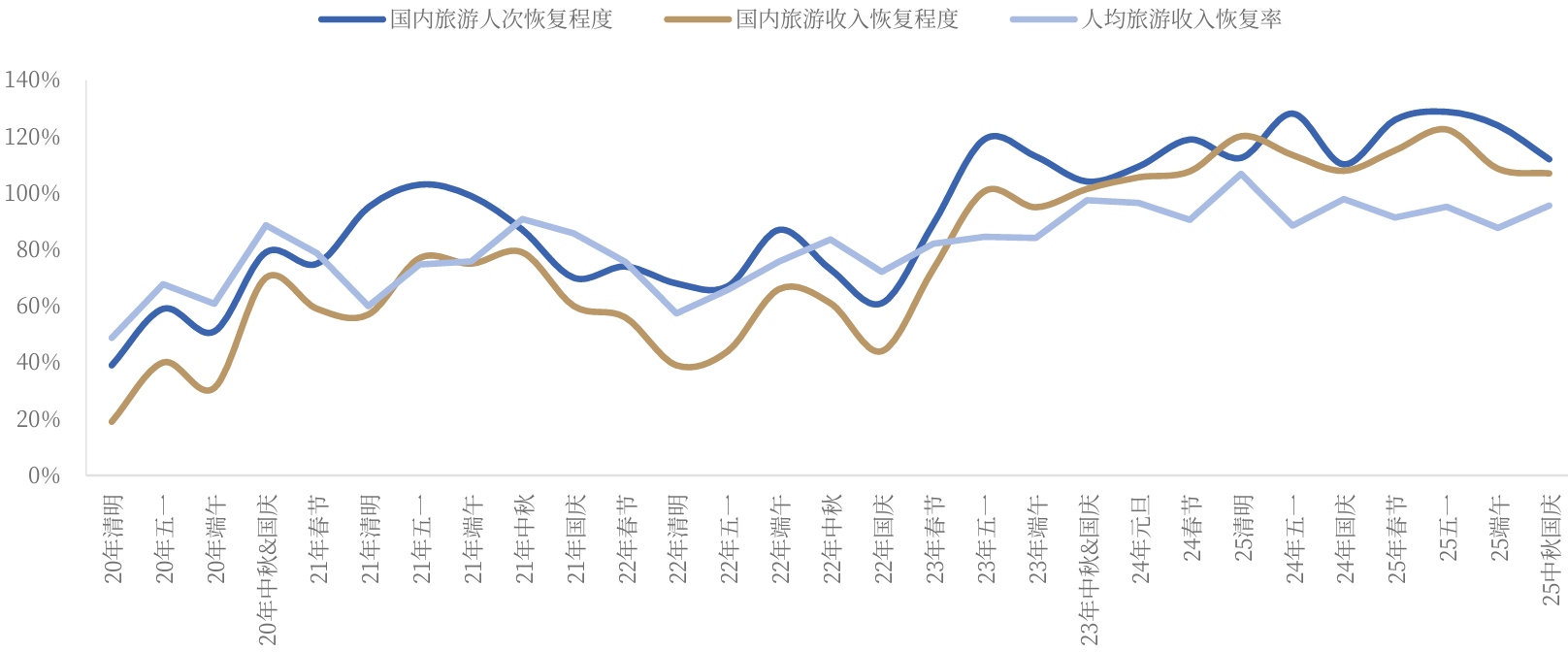 受益于假期制度优化,2025年主要节假日国内旅游人次与旅游收入恢复率均维持在2019年100%以上的较高水平。但由于国内整体消费环境仍偏弱,以及居民消费行为更趋理性,国内假期人均旅游收入恢复率持续徘徊于公共卫生事件前90%左右水平。