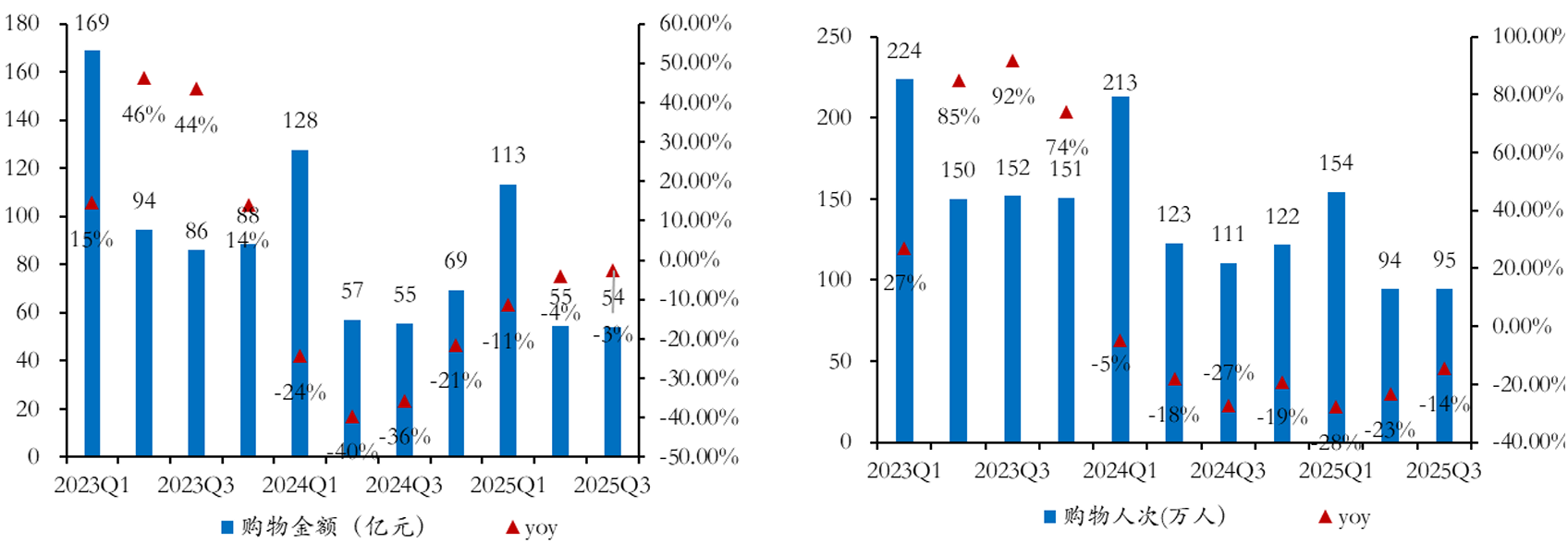 政策利好频出,旨在进一步发挥免税店政策支持提振消费的作用。据财政部,为稳步推进海南自由贸易港建设,进一步满足消费者多元化购物需求,财政部、海关总署、税务总局联合印发公告,调整海南离岛旅客免税购物政策,并定于2025年11月1日起实施。政策调整具体内容包括扩大离岛免税商品范围、指定品类国货退税、提高年龄门槛至18岁、允许离境旅客享受离岛免税政策、岛民一次离岛可多次即购即提。离岛政策调整后将有利于扩大离岛免税政策享惠面,增加商品供给,改善消费者购物体验,提升岛内居民获得感,推动海南自由贸易港建设不断取得新成效。继此前离岛免税政策优化后口岸免税迎来利好,10月30日财政部等五部门联合印发通知,完善免税店政策支持提振消费,举措包括 1)积极支持国内商品进入免税店销售;2)进一步扩大免税经营品类,新增手机、微型无人机、运动用品、保健食品、非处方药、宠物食品等热销商品;3)放宽免税店审批权限;4)支持口岸出境免税店、口岸进境免税店和市内免税店提供网上预订服务。政策利好有望激发免税消费潜力,当前免税销售拐点显现,展望2026年有望延续良好的复苏态势。