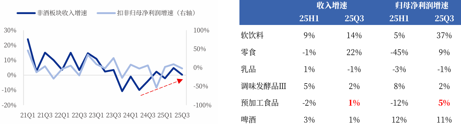 图:非酒板块单季度收入、利润增速 图:25H1新消费领先,25H2传统消费接力 |