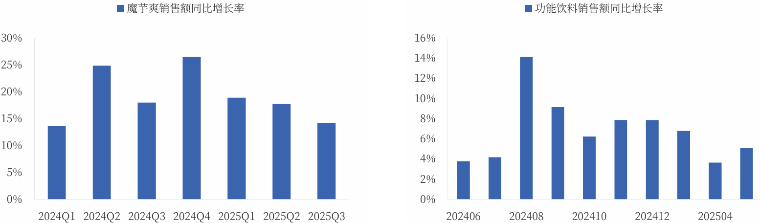 图:魔芋零食产品2024年以来持续高度景气 图:2025年功能饮料同比持续增长 |