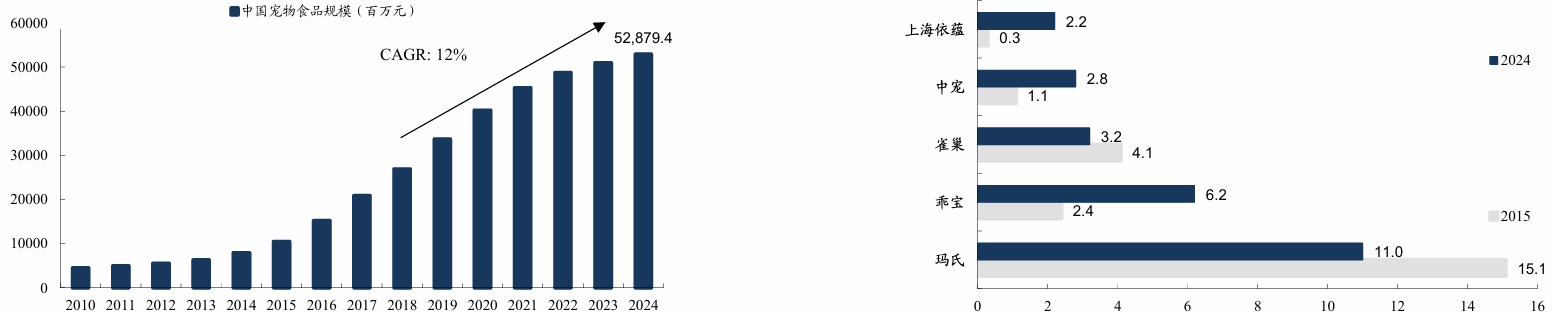 图:中国宠物食品市场规模持续增长 图:中国宠物食品公司CR5占比情况 |