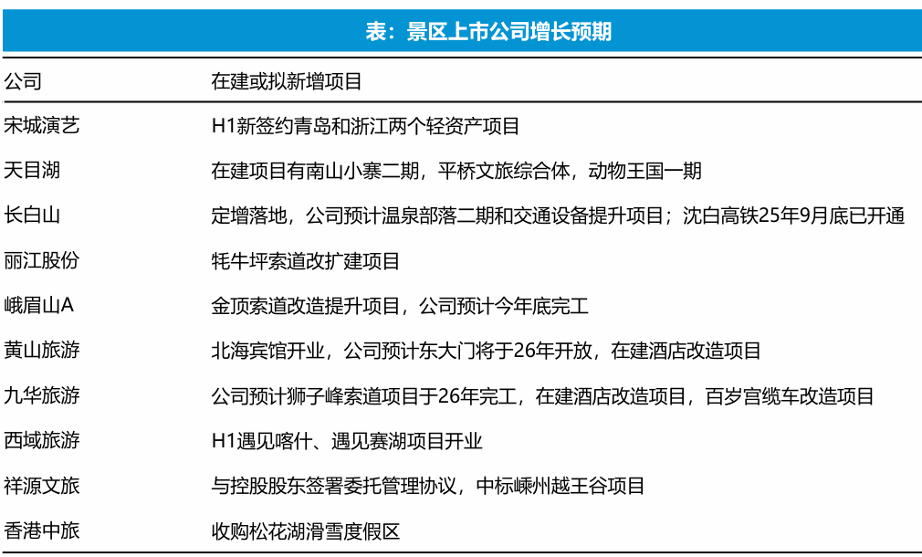 2025年内旅游板块走势部分受到客流高基数、天气影响等而有所承压,景区和旅游板块的主要逻辑转变为新场景的落地、优质资产的注入。新场景端,如低空旅行、AI互动和机器人等业态仍处在快速发展期,与文旅结合的成熟时间点尚待验证,预计2026年这两个方面仍然是文旅发展的主线逻辑。景区上市公司稳步推进产能扩张或资产整合,提高接待能力,关注有边际变化的标的。