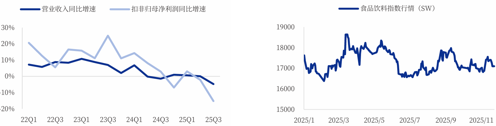 图:食品饮料行业单季度收入、利润增速 图:食品饮料行业指数2025年以来走势 |