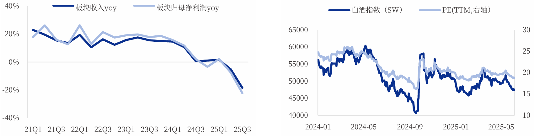 白酒板块2025年深度调整,25Q1收入/归母净利润分别同比+2%/+2%,25Q2分别同比-5%/ 7%,25Q3分别同比-18%/-22%,其中25Q3供给加速出清,主要系6月以来餐饮消费政策叠加宏 观需求走弱导致终端动销明显承压,同时渠道库存压力较大,上市公司主动降速、为行业纾解压力。