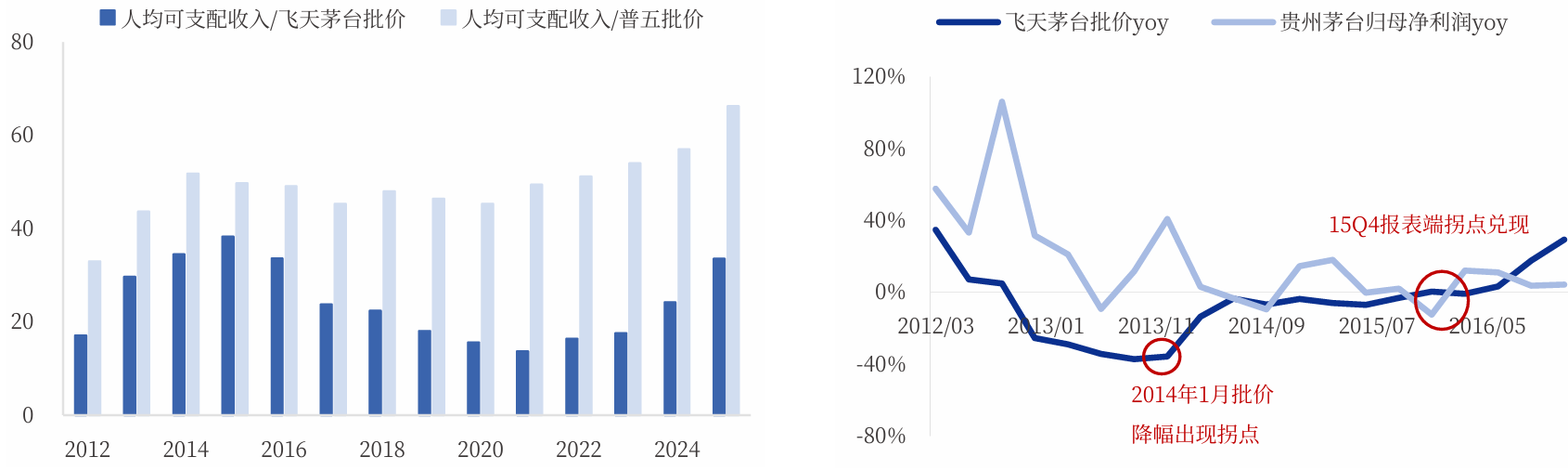 动销与批价下滑幅度有望收窄。1)从动销维度来看,2025年行业承压明显,一方面系商务消费场景疲弱,另一方面系“禁酒令”大幅冲击政务消费场景及其带来连锁效应,但我们认为这属于一次性冲击、其影响正在边际趋缓,因此2026年动销下滑幅度有望逐渐收窄。2)从批价维度来看,2025年10月底茅台飞天批价1675元,普五批价855元,二者相较于2024年城镇居民人均可支配收入的比值分别为3%、2%,而上一轮调整周期中(2014-2015年)茅台、普五相较于人均收入的比值分别为3%、2%,总结来看批价下跌空间已不大,预计2026年跌幅有望收窄。