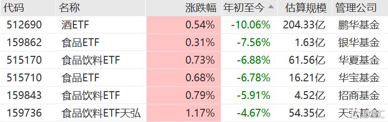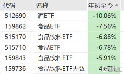 今年以来,酒ETF跌超10%,食品ETF、食品饮料ETF跌超6%。