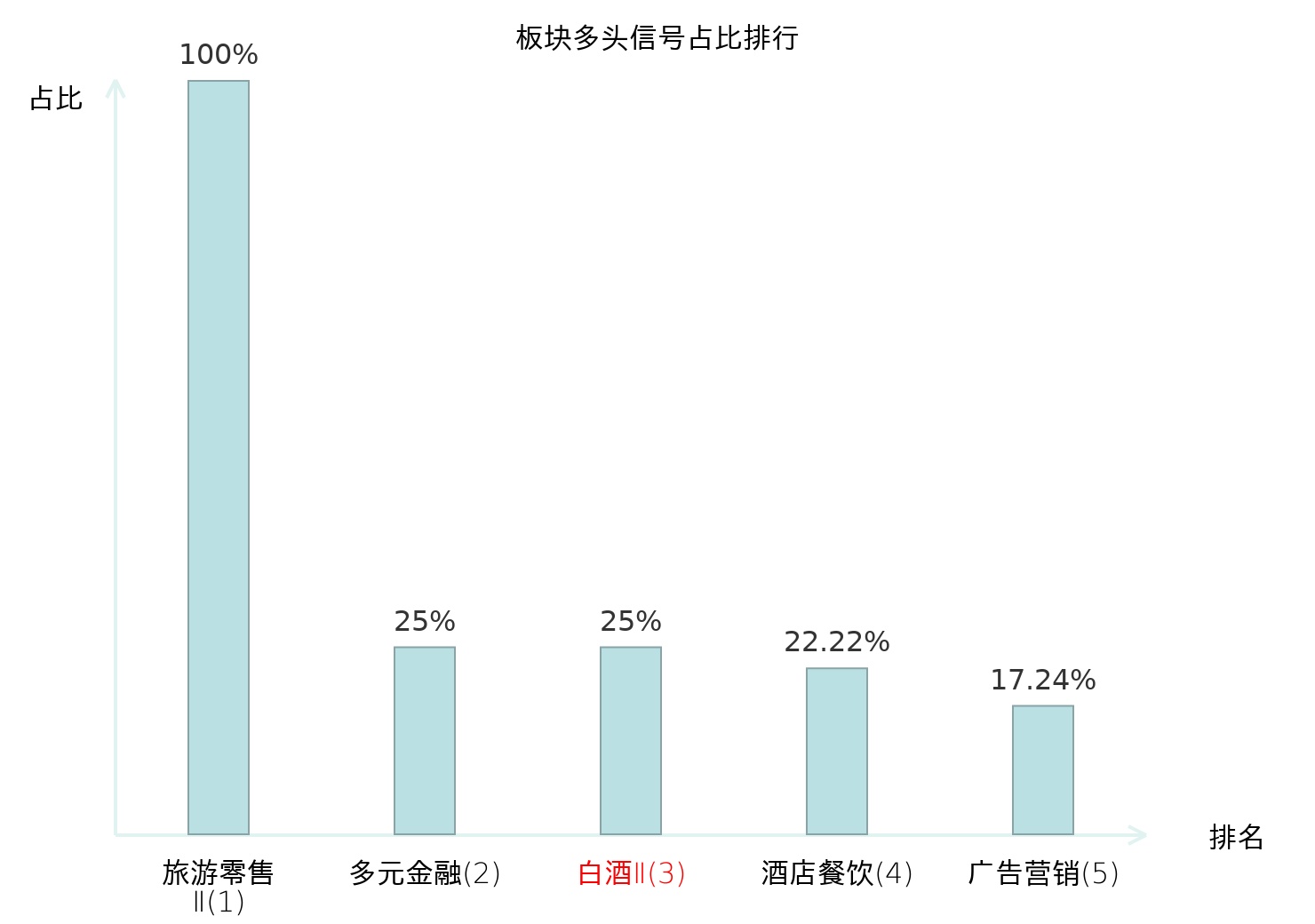 全市场所有行业板块中主力多头信号占比排名中,旅游零售Ⅱ板块位居第一。旅游零售Ⅱ板块名次提升最快,较昨日上升130位。