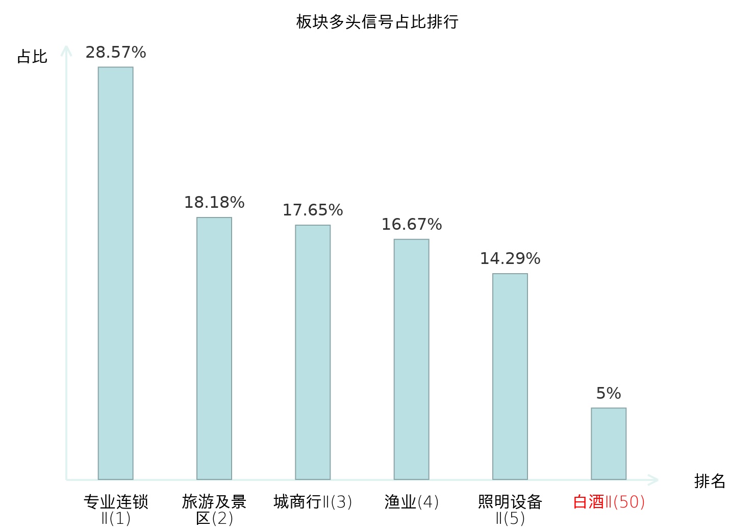 全市场所有行业板块中主力多头信号占比排名中,专业连锁Ⅱ板块位居第一。专业连锁Ⅱ板块名次提升最快,较昨日上升120位。