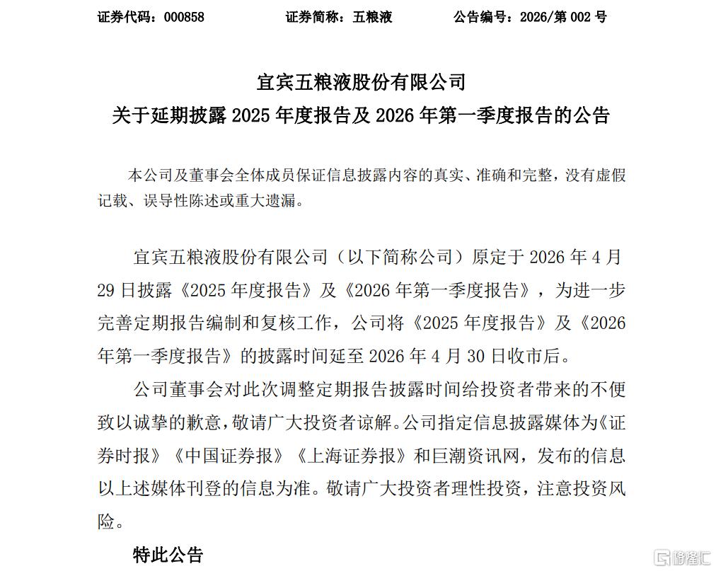 4月28日,五粮液公告称,将《2025年度报告》及《2026年第一季度报告》的披露时间延至2026年4月30日收市后。