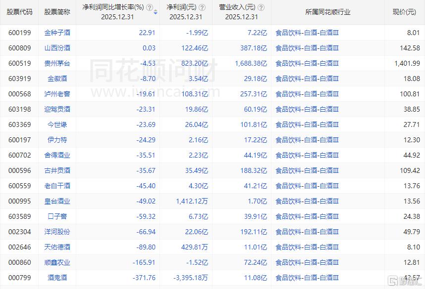 酒鬼酒2025年营收11亿元,同比下降22.17%,归属于上市公司股东的净利润为亏损3395万元,同比大降371.76%。