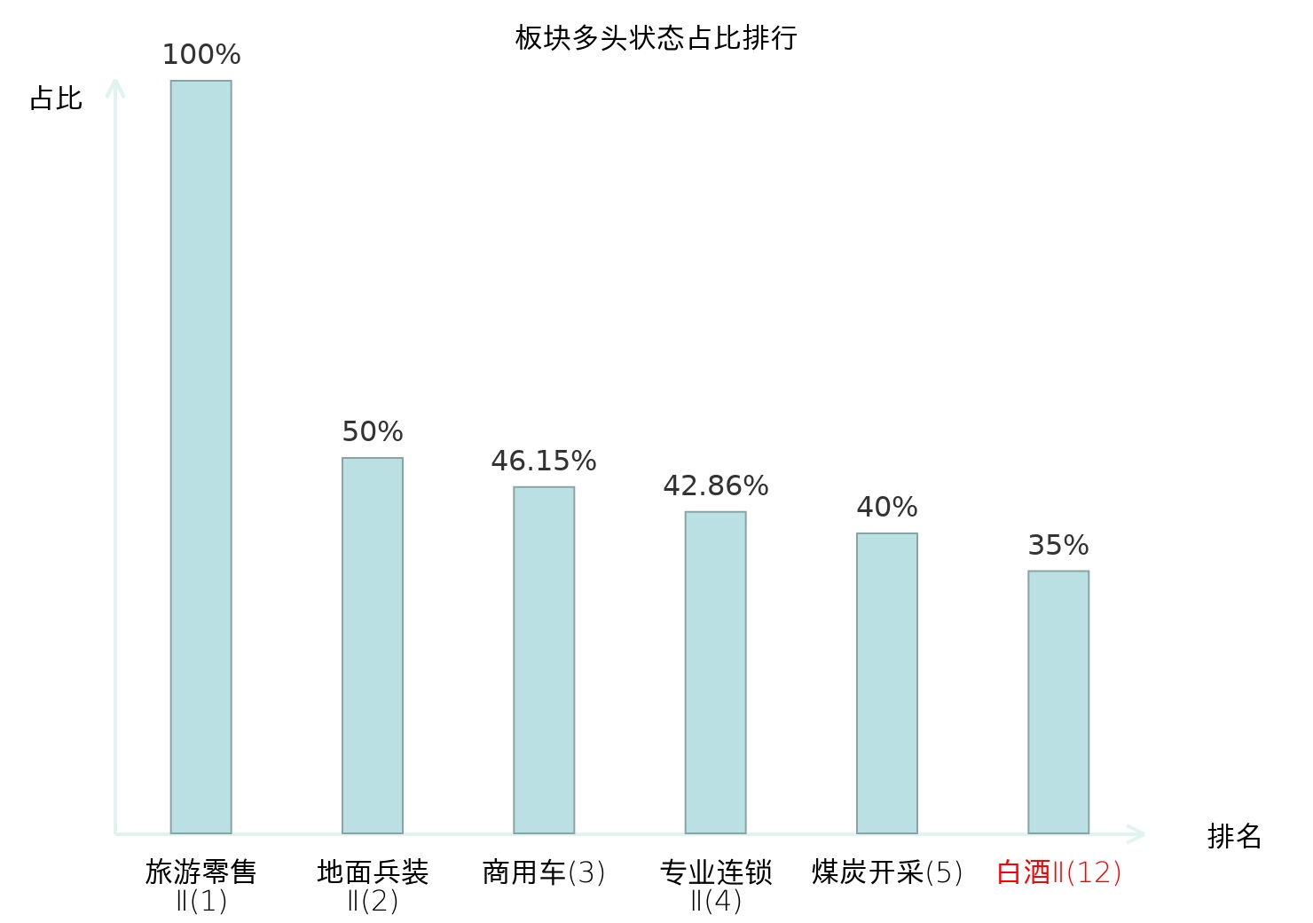全市场所有行业板块中主力多头状态占比排名中,旅游零售Ⅱ板块位居第一。汽车服务板块名次提升最快,较昨日上升83位。