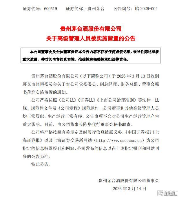 当日晚,贵茅火速发布关于高级管理人员被实施留置的公告。