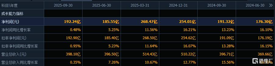 而单看第三季度,公司实现营收398.1亿元,同比增长0.35%;归母净利润192.24亿元,同比增长0.48%。