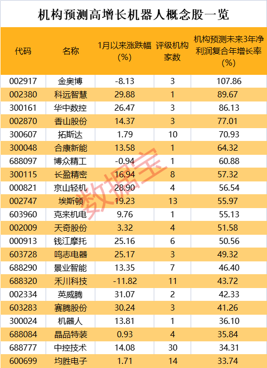 机构评级来看,科沃斯、美的集团、中控技术均超30家机构的密切关注。机构一致预测金奥博、科远智慧、华中数控等22股未来3年净利润复合年增长率有望达30%及以上的高增长。
