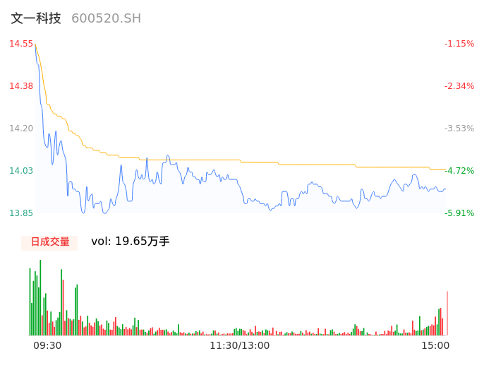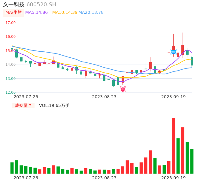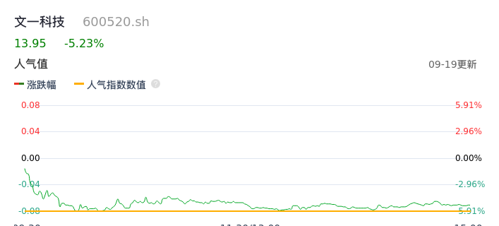 09月19日,文一科技收报13.95,股价涨幅-5.23%,成交金额2.76亿元,换手率12.40%。