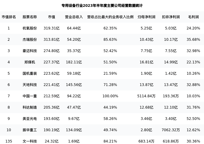 文一科技最新报告期数据为半年度,下表汇总了专用设备行业内市值靠前的公司半年度主要经营数据