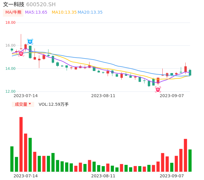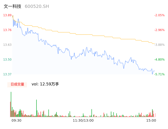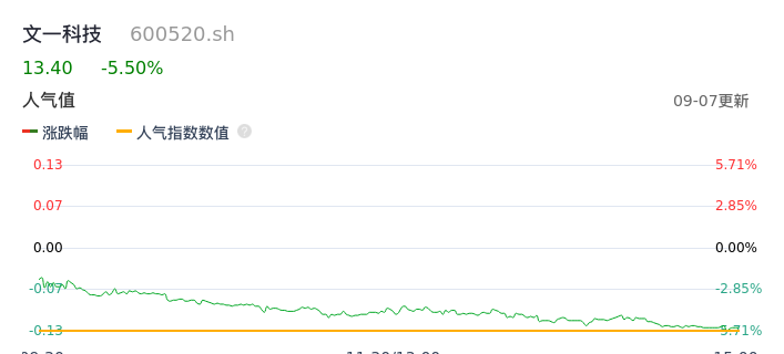 09月07日,文一科技收报13.40,股价涨幅-5.50%,成交金额1.72亿元,换手率7.94%。