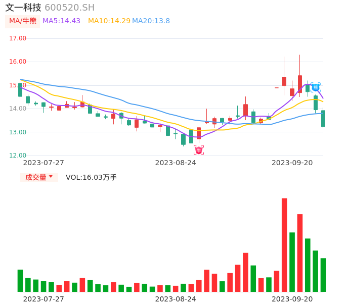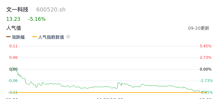 09月20日,文一科技收报13.23,股价涨幅-5.16%,成交金额2.16亿元,换手率10.12%。