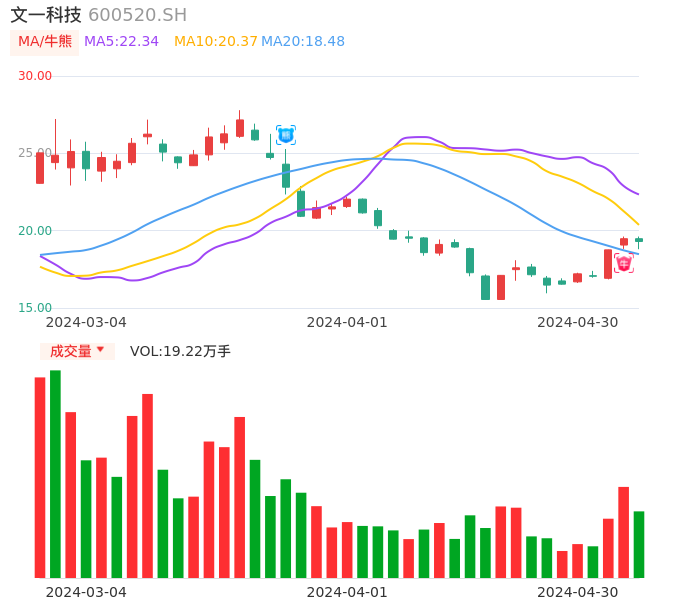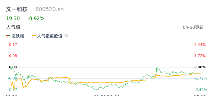 04月30日,文一科技收报19.30,股价涨幅-0.92%,成交金额3.69亿元,换手率12.13%。