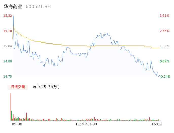 04月16日,华海药业收报14.76,股价涨幅-0.27%,成交金额4.47亿元,换手率2.03%。