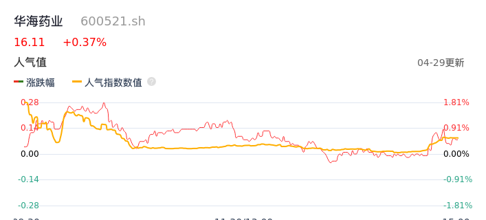 04月29日,华海药业收报16.11,股价涨幅0.37%,成交金额2.64亿元,换手率1.12%。