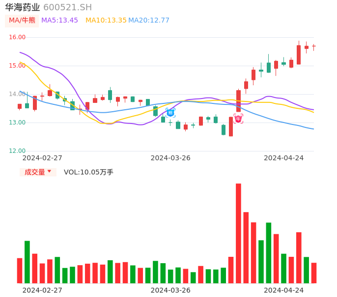 04月24日,华海药业收报15.69,股价涨幅0.00%,成交金额1.57亿元,换手率0.69%。