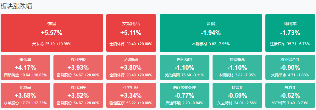 板块方面,足球、美容护理、银行、创新药等板块涨幅居前,汽车整车、钢铁、白酒、电力等板块跌幅居前。截至收盘,沪指涨0.48%,深成指涨0.35%,创业板指涨0.73%。