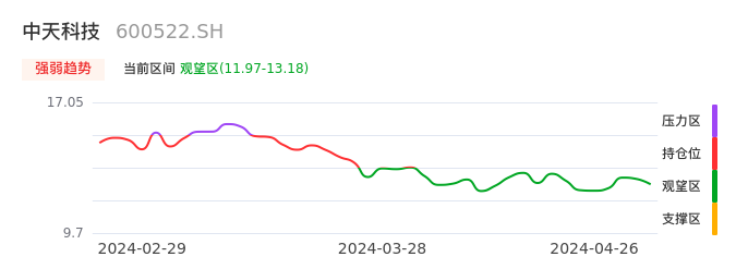 我们来看一下该股的九方特色指标强弱趋势的情况:中天科技自04月02日从持仓区下穿到观望区,股价近期持续走弱。短期已经进入空头行情,且下跌动能仍未衰竭。建议继续谨慎观望。