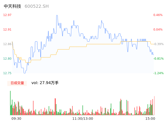 04月25日,中天科技收报12.82,股价涨幅-0.70%,成交金额3.59亿元,换手率0.82%。