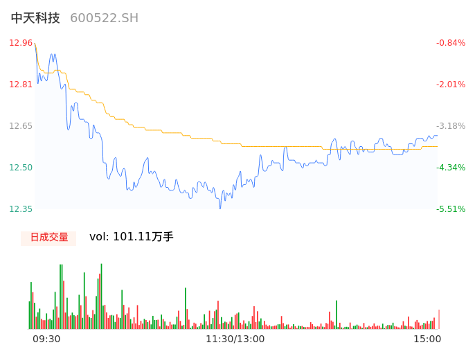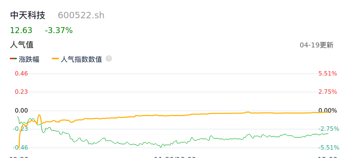 04月19日,中天科技收报12.63,股价涨幅-3.37%,成交金额12.72亿元,换手率2.96%。