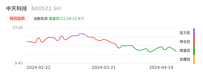 我们来看一下该股的九方特色指标强弱趋势的情况:中天科技自04月02日从持仓区下穿到观望区,股价近期持续走弱。短期已经进入空头行情,且下跌动能仍未衰竭。建议继续谨慎观望。