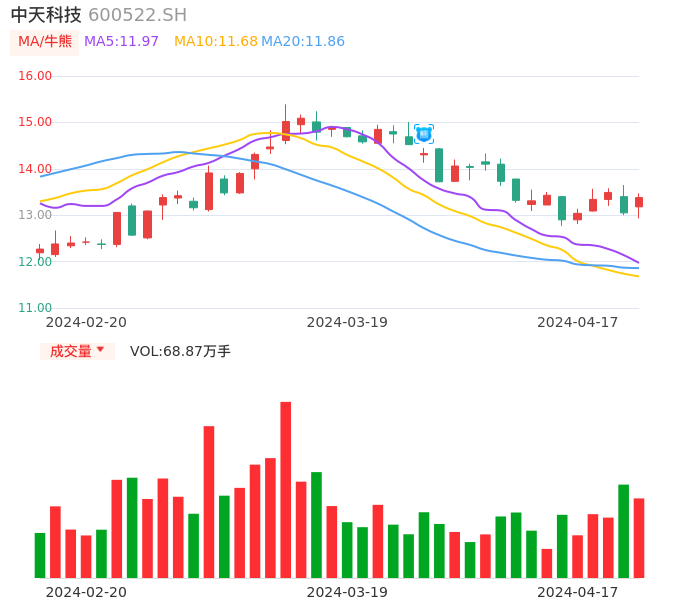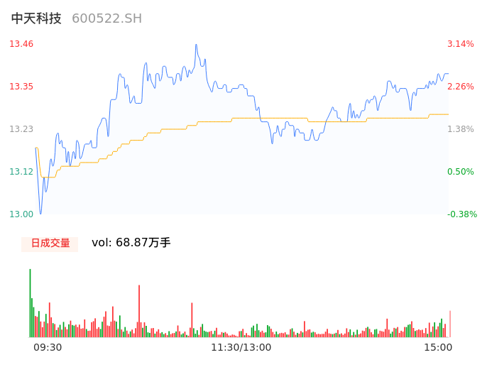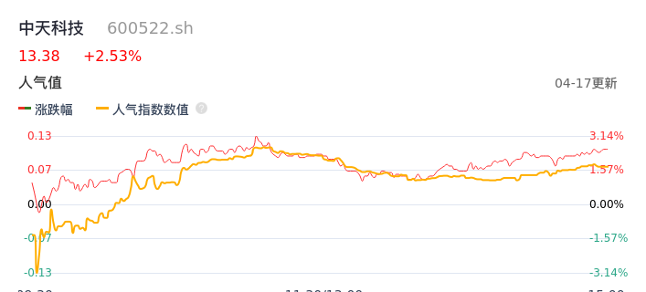 04月17日,中天科技收报13.38,股价涨幅2.53%,成交金额9.14亿元,换手率2.02%。