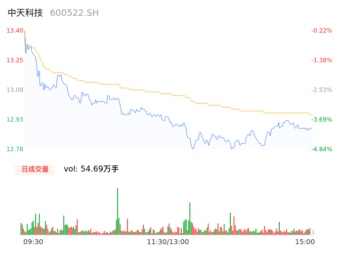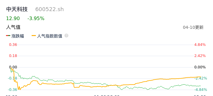 04月10日,中天科技收报12.90,股价涨幅-3.95%,成交金额7.09亿元,换手率1.60%。