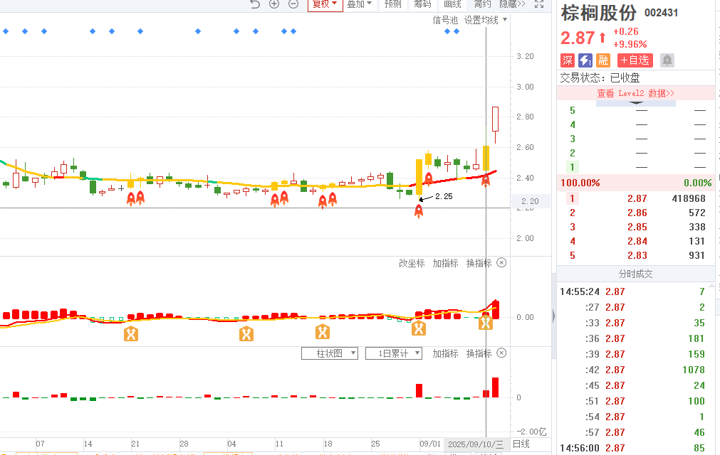 2)20250910-棕榈股份-四维操盘-近期出现火箭信号且底部量柱由绿转红