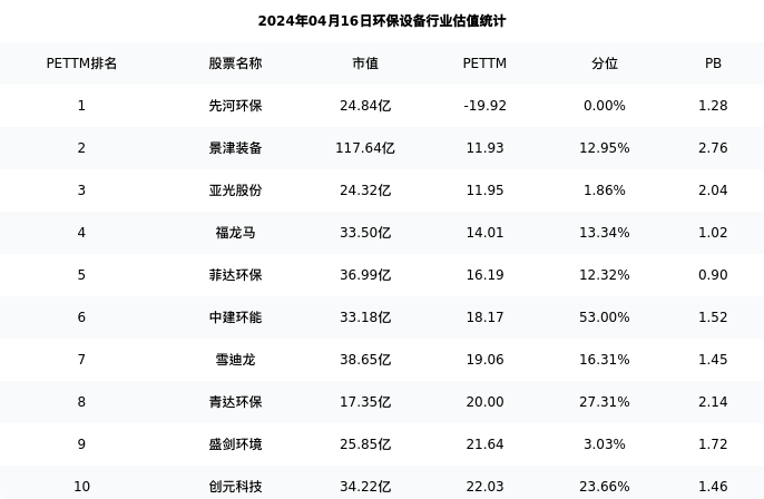 从估值角度看:菲达环保最新市盈率PETTM为16.19,在行业内排名4/28,处于12.32分位。