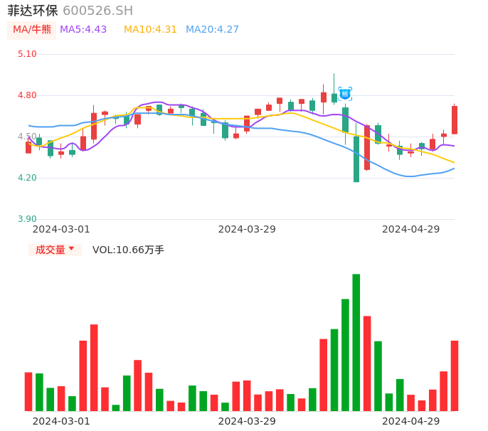 04月29日,菲达环保收报4.72,股价涨幅4.42%,成交金额4959.70万元,换手率1.50%。